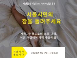 [한국4차산업신문] 서울시가 “서울시민의 잠을 돌려주세요”를 부제로 온라인 의견수렴을 실시한다. 이번 의견수렴은 자동차전용도로와 맞닿은 곳에서 생활하는 시민들의 소음피해를 줄이고, 삶의 질을 향상시킬 효과적인 대책마련을 위해 진행된다.