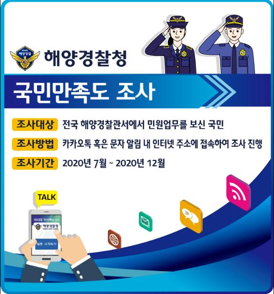 해양경찰청(청장 김홍희)은 7월부터 국민들의 해양경찰청 정책서비스 만족도 수준을 파악하고자 ‘국민만족도’를 조사한다고 16일 밝혔다.