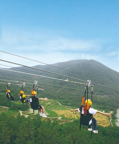 남열 공중하강체험 시설은 단일 세계 해상 최장거리(1.53km)의 시설로 활강4라인에 기존시설과 달리 일반형 외에도 체어형, 슈퍼맨형 등 다양한 하강유형을 체험할 수 있으며, 최대 활강속도 70~80km/h로 고속 활강 스릴과 저속 구간에서는 수려한 해안 경관을 여유롭게 감상 할 수 있다.