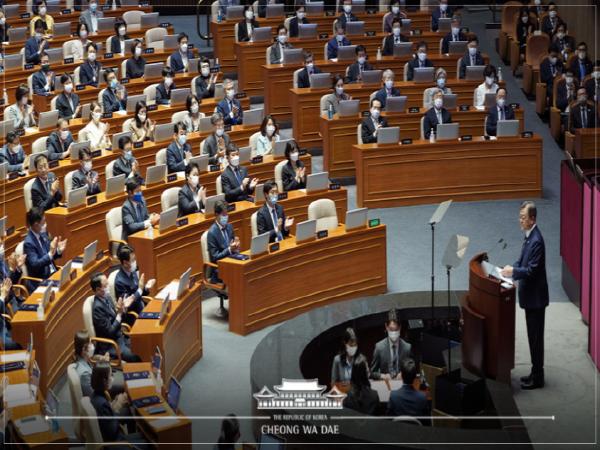 이와 함께 대통령은 "한국판 뉴딜이 성공하기 위해서는 국회의 협력이 필수적"이라며 "한국판 뉴딜을 국가발전 전략으로 삼아 세계를 선도하는 나라로 도약하는 길을 함께 걷기를 희망한다"고 말했다.
