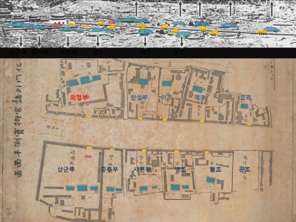 의정부와 육조거리를 사이에 두고 있었던 삼군부 역시 중심건물 세 전각이 나란히 있고 그 외곽을 행랑이나 조방이 감싸고 있는 형태였다. 삼군부의 경우 세 건물 중 총무당(중심건물)과 청헌당(총무당 좌측 건물)이 각각 낙산공원과 육군사관학교로 옮겨져 보존되고 있지만, 의정부 내 건물은 모두 멸실돼 사진으로만 짐작할 수 있었다.