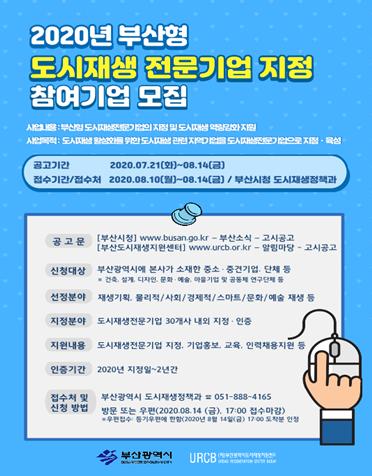 시는 이번 공모를 통해 연간 5~6천억 원 규모로 추진하는 도시재생뉴딜사업을 비롯한 부산시의 도시재생사업에 지역기업의 적극적인 참여를 이끌어 내고, 부산형 도시재생을 선도하는 도시재생전문기업을 육성한다는 방침이다.