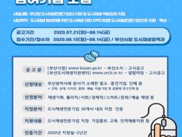 접수는 8월 10일부터 14일까지 진행되며 부산시 도시재생정책과(부산광역시 중앙대로 1001, 24층 도시재생정책과)로 방문 또는 우편으로 접수하면 된다. 자세한 사항은 부산시청 홈페이지>고시공고(http://www.busan.go.kr/nbgosi)를 참고하면 된다.