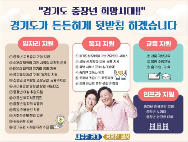 도는 ‘중장년의 활기찬 삶, 건강한 삶, 성공적인 삶 지원’이라는 비전 아래 일자리, 교육, 복지, 지원체계 구축 등 4개 분야 25개 과제를 추진할 계획이다.