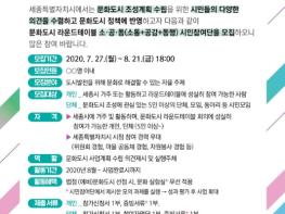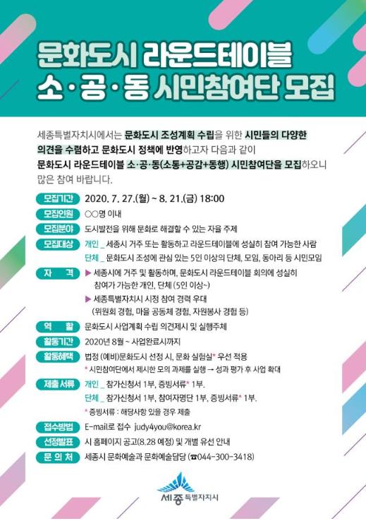 세종특별자치시(시장 이춘희)가 문화체육관광부 주관의 법정 문화도시 조성을 위해 다양한 시민 의견을 수렴해 문화정책에 반영하고자 ‘문화도시 라운드테이블 소·공·동 시민참여단’을 모집한다.