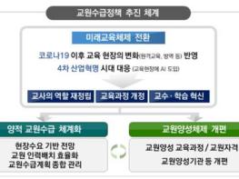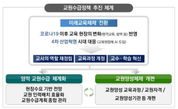정부는 코로나19로 인한 디지털 전환, 인구구조 변화, 4차 산업혁명 등 급변하는 환경에 대응하는 미래교육으로 전환하기 위해, 상시적인 학교방역을 위한 학급당 적정 학생 수 산정 및 과밀학급 해소, 초등학교 안심학년제, 고교학점제, 기초학력보장 등 교육격차 해소, 디지털 기반 교육혁신 수요를 반영한 새로운 교원수급체계(가칭, K-교육 선도형)를 마련할 계획이다.