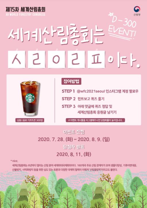 산림청(청장 박종호)은 2021년 5월 24일부터 28일까지 서울 코엑스에서 개최되는 제15차 세계산림총회 300일 전(前)을 기념하기 위해 7월 28일부터 13일 동안 공식 누리소통망을 통한 온라인 행사를 진행한다.
