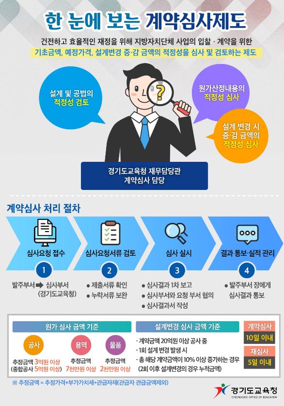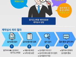 계약심사제도는 경기도교육청이 2012년 전국 교육행정기관 가운데 최초 도입한 것으로 교육행정기관과 공립학교, 공립 유치원이 발주한 각종 공사·용역·물품 계약 체결 전에 원가 산정 적정성을 검토하고 분석해 예정 가격을 결정함으로써 예산 낭비를 방지하는 제도다.