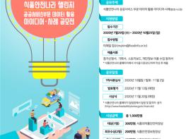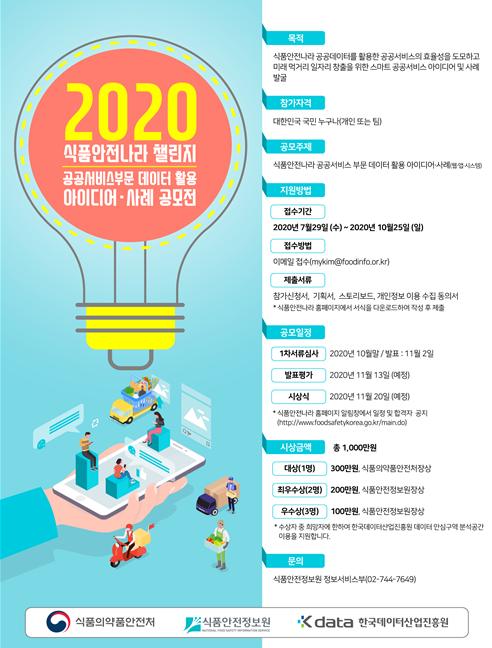 식품의약품안전처(처장 이의경)는 식품안전나라 공공데이터 활용을 위해 전 국민을 대상으로 우수한 아이디어를 발굴하는 ‘2020 식품안전나라 공모전’을 식약처 누리집을 통해 10월 25일까지 개최합니다.