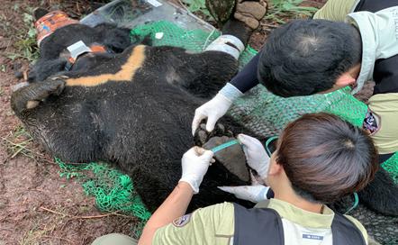 국립공원공단은 포획한 반달가슴곰에 발신기를 부착한 후 바로 재방사했다.