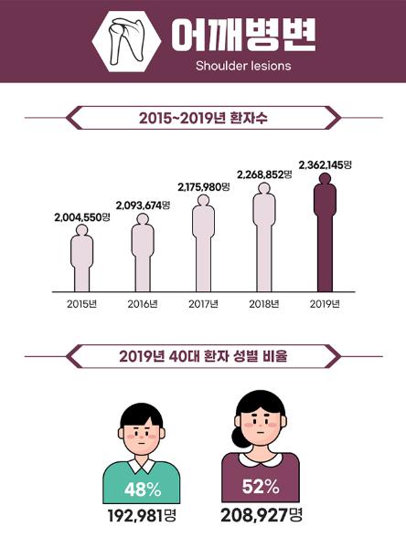 건강보험심사평가원의 통계에 따르면 어깨병변 외래 환자는 2015년 200만 명에서 2019년 236만 명으로 4년간 약 18% 증가했습니다. 2019년 환자 중 40대 환자는 약 40만 명이었는데요. 이 중 남성이 약 19만 명, 여성이 약 21만 명으로 여성이 조금 더 많았습니다.