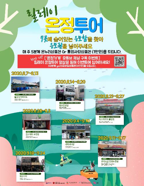 통영시(시장 강석주)는 8월 7일부터 9월 24일까지 기부활동에 참여하는 소상공인업체를 홍보하기 위해 릴레이 온정투어 이벤트와 온정가게 유튜브 채널 구독이벤트를 동시에 실시한다.