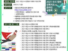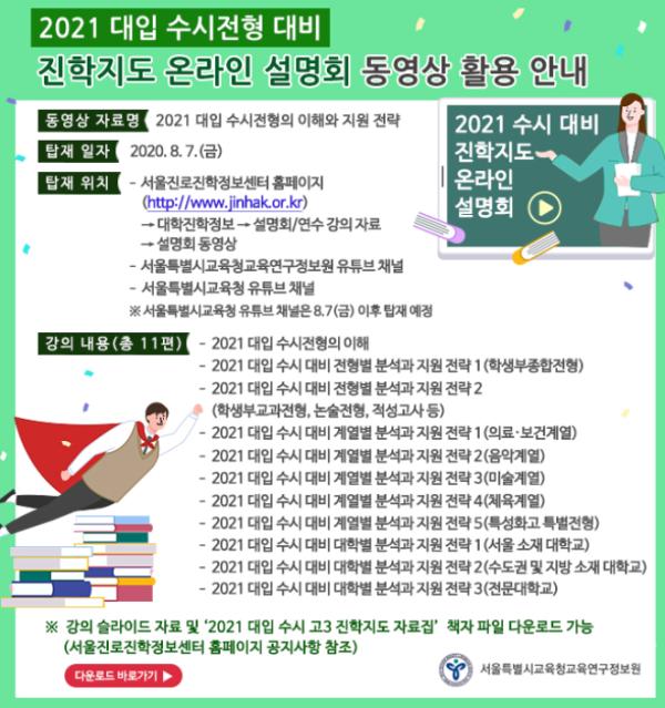 서울특별시교육청(교육감 조희연) 산하 교육연구정보원(원장 송재범)은 『2021학년도 대입 수시전형 대비 진학지도 온라인 설명회』 동영상 자료를 제작하여 서울진로진학정보센터 홈페이지(http://www.jinhak.or.kr)와 서울시교육청 및 교육연구정보원 유튜브 채널을 통하여 8월 7일부터 제공한다.