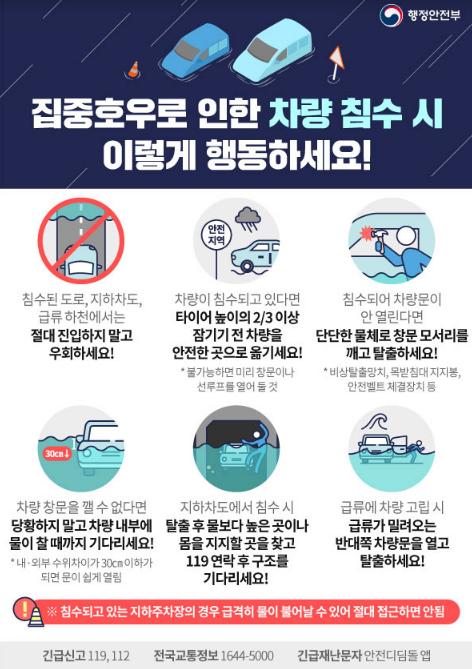 지하차도에서 침수 시 탈출 후 물보다 높은 곳이나 몸을 지지할 곳을 찾고 119 연락 후 구조를 기다리세요!
