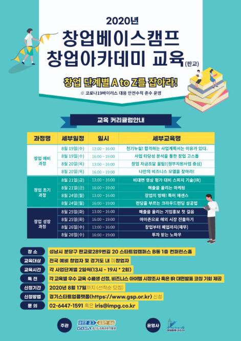교육은 1차와 2차로 나누어 진행된다. 1차 과정은 8월 19일부터 26일까지 성남 판교 스타트업캠퍼스에서, 2차는 9월 3일부터 11일까지 수원 광교 경기도경제과학진흥원에서 각각 진행될 예정이다.