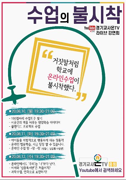 경기도교육청(교육감 이재정)이 10일부터 사흘간 유튜브 채널 ‘경기 교사온TV_중등’을 통해 원격수업 운영 경험 나눔과 사례 확산을 위한 실시간 강연회를 한다.