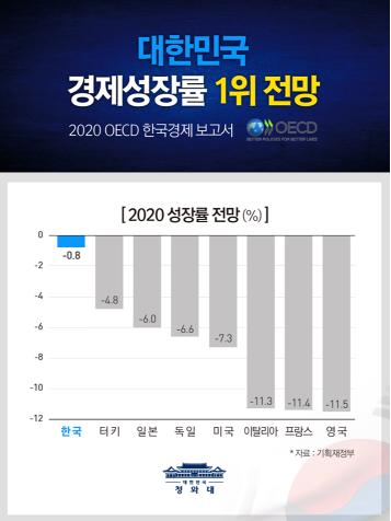 경제협력개발기구(OECD)는 오늘 '2020 OECD 한국경제보고서'를 발표했다. 이에 따르면, 올해 우리나라의 경제성장률은 -0.8%로, OECD 37개 회원국 중 1위로 나타났다.