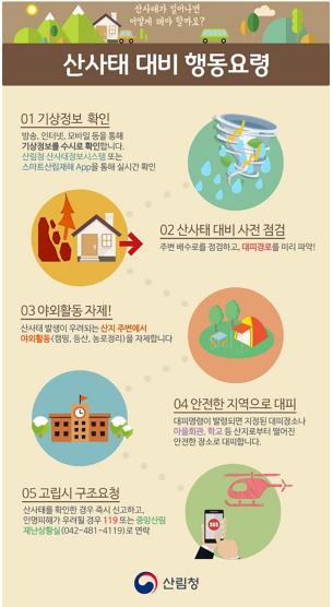 산사태를 확인한 경우 즉시 신고하고, 인명피해가 우려될 경우 119 또는 중앙산림 재난상황실 (042-481-4119)로 연락