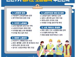 이에 경기도는 ‘노동이 존중받는 공정한 세상’을 민선7기 노동정책 비전으로 확립하고 ①노동분권 강화 ②안전한 노동일터 조성 ③촘촘한 노동복지 실현 ④노동권익보호 확대 및 강화 ⑤노동 거버넌스 활성화 등 5개 분야 추진전략을 설정해 다양한 정책과 사업들을 추진한다.