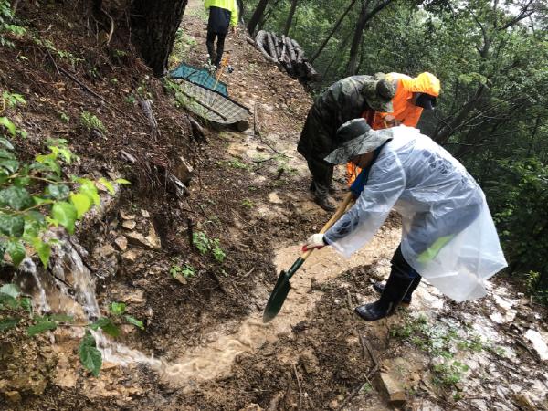 집중호우 시에는 배수가 가장 중요함에 따라 소속 공무원을 비롯하여 임도관리단, 산사태현장예방단, 숲가꾸기패트롤, 산림바이오매스수집단 등 약 50여명을 투입하여 배수로나 집수정이 막히는 부분이 없도록 점검 및 정비하고, 예년보다 많은 강우량을 고려하여 산림 내 남아있는 숲가꾸기 부산물 등은 계곡부로 유입되지 않도록 보다 안전한 곳으로 이동할 계획이다.