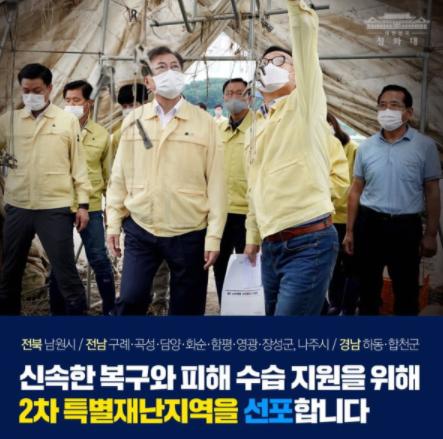 [한국4차산업신문] 문재인 대통령은 오늘 이번 집중호우로 심각한 피해가 발생한 남부 지역의 신속한 복구와 피해 수습 지원을 위한 2차 특별재난지역 선포를 재가했다.