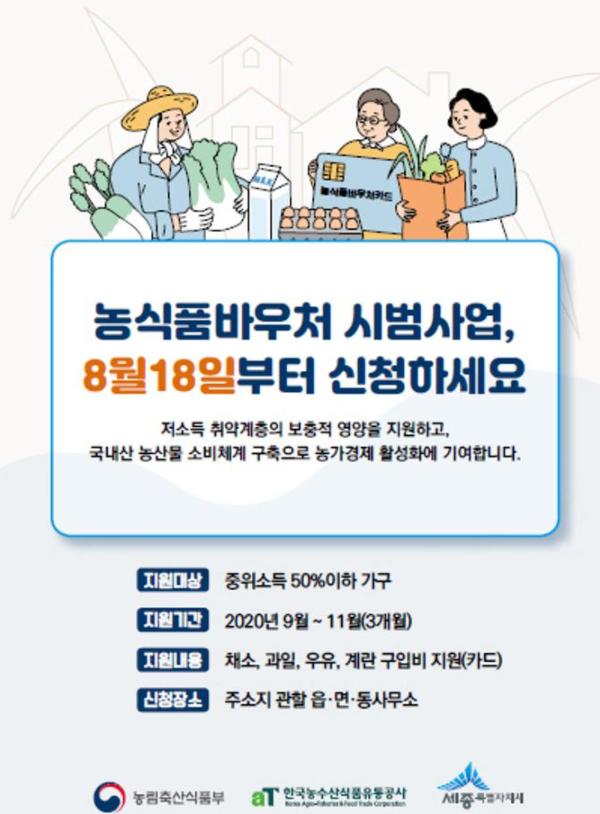 세종특별자치시(시장 이춘희)가 저소득층에 농식품을 구입할 수 있는 전자바우처를 지원하는 ‘2020 농식품바우처 시범사업’을 추진하기로 하고 18일부터 신청·접수를 시작한다.