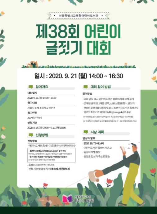 서울특별시교육청(교육감 조희연) 산하 어린이도서관(관장 서운택)에서는 서울 소재 초등학교 6학년을 대상으로 9월 21일(월) 사회적 거리두기에 맞추어 온라인으로「제38회 어린이글짓기대회」를 개최한다.