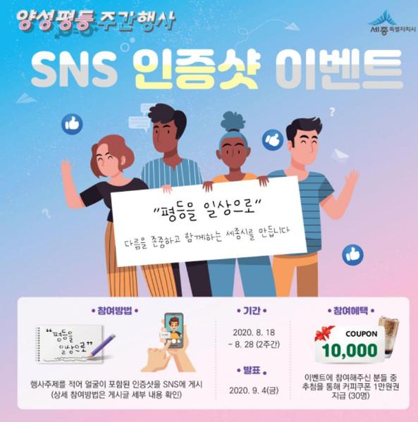 세종특별자치시(시장 이춘희)가 오는 9월 첫 주 양성평등주간을 앞두고 양성평등문화 확산 분위기 조성을 위한 사전 행사로 SNS 인증 샷 이벤트를 실시한다.