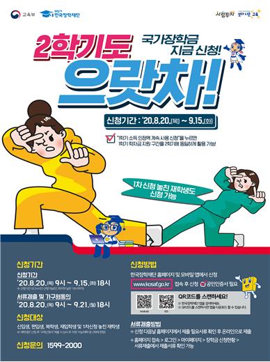 교육부(부총리 겸 교육부장관 유은혜)와 한국장학재단(이사장 이정우)은 8월 20일 9시부터 9월 15일 18시까지 2020학년도 2학기 국가장학금 2차 신청을 받는다.