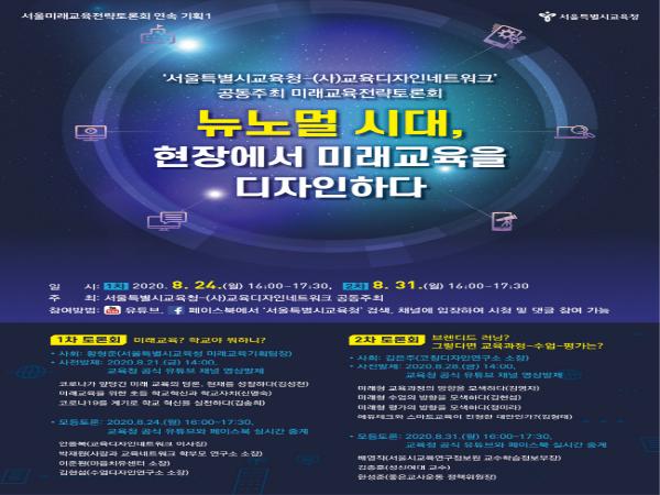 서울특별시교육청(교육감 조희연)은 (사)교육디자인네트워크와 공동으로 『뉴노멀 시대, 현장에서 미래교육을 디자인하다』를 주제로 8월 24일과 31일 두 차례에 걸쳐 온라인 토론회를 개최한다.