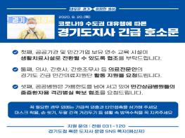 이 지사는 이같은 대도민 호소에 이어 공공기관과 민간기업·단체 의료인, 병원을 향해 코로나19 방역을 위한 적극적인 협조를 호소했다.
