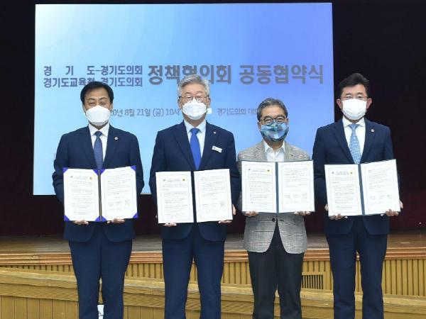 경기도교육청(교육감 이재정)과 경기도의회(의장 장현국)가 21일 경기도의회 대회의실에서 ‘정책협의회 공동협약’을 맺고 경기도교육청 주요 정책 논의와 현안 해결을 위해 힘을 모으기로 했다.