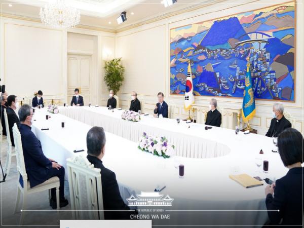 이 자리에는 염수정 추기경, 김희중·조환길 대주교 등 천주교 지도자 9명이 참석했다. 참석자 모두 마스크를 착용했으며 옆자리는 2m, 마주보는 거리는 4m 간격을 유지해 앉았다.