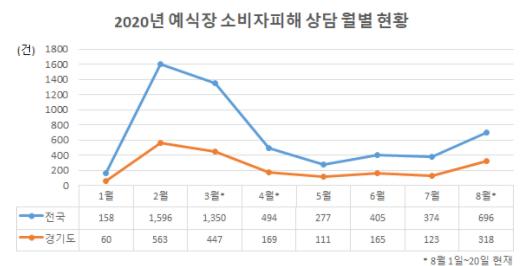 월별 상담추이를 보면 1월에는 60건이던 결혼식장 관련 상담이 코로나가 확산되던 2월 563건, 3월 447건으로 증가했다가 4월 이후 150건 전후로 감소했다. 그러나 수도권을 중심으로 코로나19가 재확산되면서 8월에만 20일까지 318건의 상담이 접수되는 등 큰폭의 증가세를 보이고 있다.