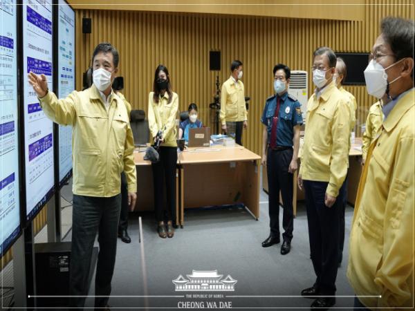 [한국4차산업신문] 문재인 대통령은 21일 서울시청 재난안전대책본부를 방문해 코로나19 수도권 재확산에 따른 서울시 대책 및 방역현황을 점검했다.