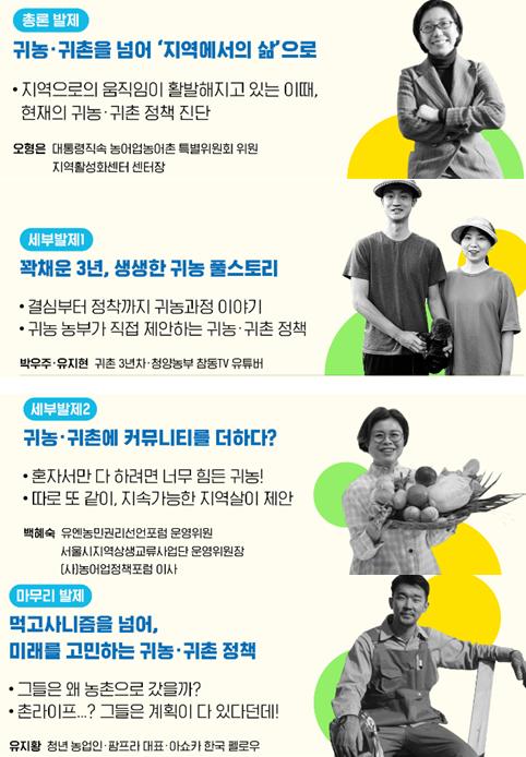 이 자리는 귀농?귀촌 정책의 현황을 진단하고, 일시적인 정착 지원에서 벗어나 지속가능한 지역살이를 위한 정책방향을 논의하면서, 생생한 귀농?귀촌 사례를 공유하기 위해 마련됐다.