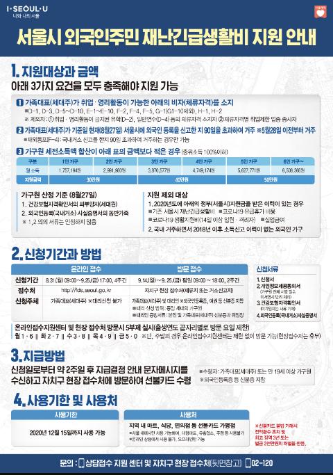지원대상은 8월 27일 현재 서울시에 외국인 등록(거소신고)을 한 지 90일이 넘고, 국내에서 합법적으로 취업?영리활동이 가능한 체류자격을 가진 외국인 주민이다.