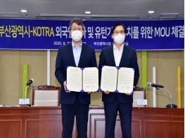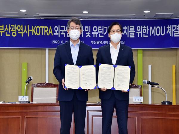 부산시(시장 권한대행 변성완)는 8월 26일 오전 11시 시청 26층 회의실에서 대한무역투자진흥공사(사장 권평오, 이하 코트라)와 「외국인 투자 및 유턴기업 유치를 위한 업무협약」을 체결했다고 밝혔다.
