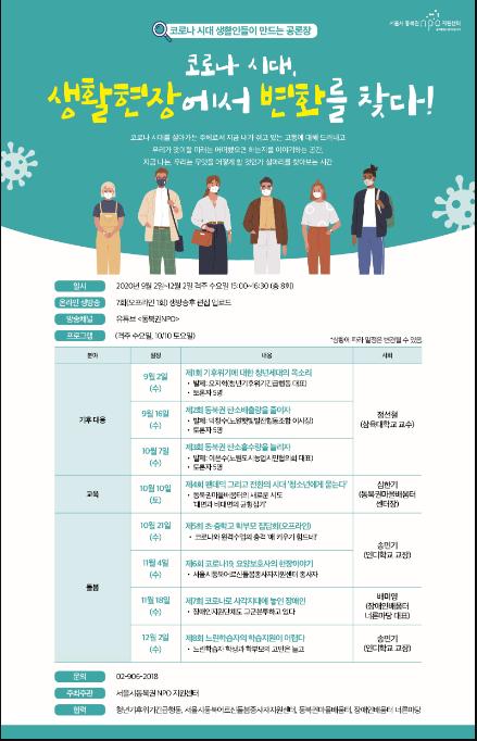 2020년 9월부터 12월까지 매 격주 수요일 15:00~16:00, 유튜브 채널 <동북권NPO>에 접속하여 “코로나 시대 생활인들이 만드는 온라인 공론장”에 참여할 수 있다. 9월 2일 수요일 첫 공론장이 열린다. 문의는 서울시동북권NPO지원센터(☎02-906-2018)로 하면 된다.