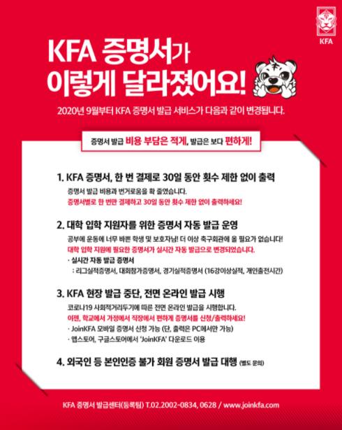 먼저 KFA는 포스트 코로나 시대를 맞이해 비대면 서비스 운영 및 사용자 편의 확대를 위해 오는 9월부터 증명서 현장 발급을 폐지하기로 했다. 이는 사회적 거리두기 및 다중이용시설 방문 자제를 권고하는 정부 지침을 따르고, 축구 관계자들의 안전을 도모하기 위함이다. 증명서 신청은 PC 뿐만 아니라 joinKFA 모바일 앱을 통해서도 가능하다.