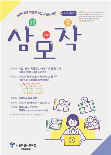 서울특별시교육청(교육감 조희연)은 8월 31일부터 9월 25일까지 총 4주에 걸쳐 초등학교 희망교원을 대상으로 수업·평가·학급경영·생활지도를 주제로 한 100개의 초등교원 커뮤니티,「삼·모·작」을 운영한다고 밝혔다.