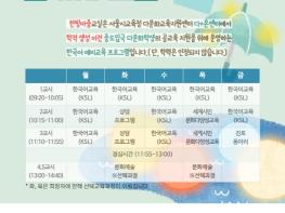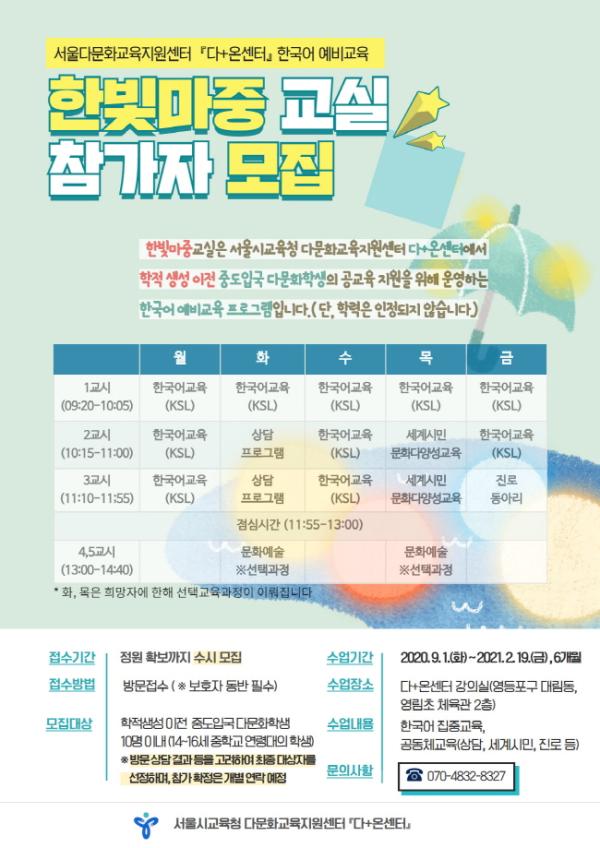 서울특별시교육청(교육감 조희연) 다문화교육지원센터「다 온센터」에서는 9월 1일(화)부터 중도입국 다문화학생을 위한 「한빛마중교실」운영을 시작한다. 한빛마중교실*은 중도입국 다문화학생이 학적을 생성하기 이전에 한국어 의사소통능력과 학교생활적응력을 갖출 수 있도록 하기 위한 한국어 예비교육 프로그램이다.