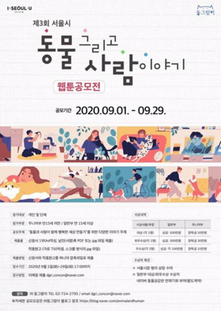 [한국4차산업신문] 서울시는 네이버 ‘동물공감’판 운영자 ㈜동그람이(대표 김영신)와 함께 제3회 서울시 ‘동물 그리고, 사람이야기’ 웹툰 공모전을 9월 1일부터 29일까지 한 달 동안 개최한다.
