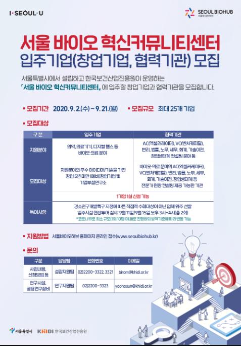 서울시는 ‘서울 바이오 혁신커뮤니티센터’ 개관에 앞서 입주 ‘창업기업’과 ‘협력기관’을 9월2일(수)부터 모집한다.