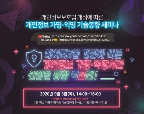 한국인터넷진흥원(KISA, 원장 김석환)은 데이터 3법이 시행됨에 따라 보다 안전한 개인정보의 활용을 위해 ‘2020 개인정보 가명·익명 기술동향 세미나’를 2020. 9. 3일 온라인으로 개최한다고 밝혔다.