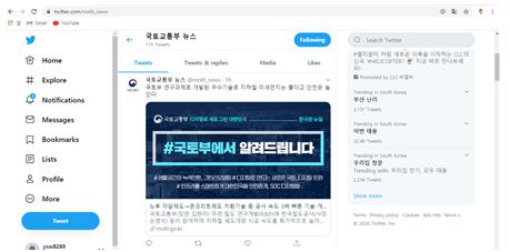 국토교통부 보도자료 트위터 계정은 https://twitter.com/molit_news(@molit_news)이며, 팔로우를 설정하면 트위터로 보도자료를 실시간 확인할 수 있다.