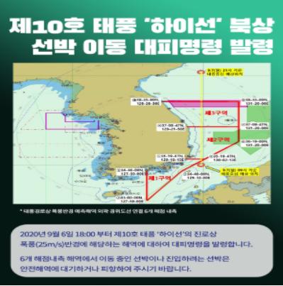 해양경찰청(청장 김홍희)은 제10호 태풍 ‘하이선(HAISHEN)’ 이 북상함에 따라 6일 오후 6시부터 해당해역의 태풍특보가 해제될 때까지 모든 선박의 운항을 중지하는‘ 선박 이동 및 대피 명령’을 발령한다고 밝혔다.