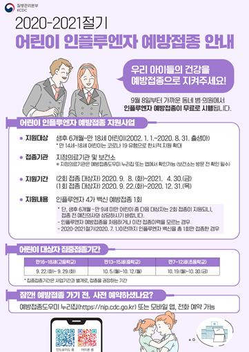 그 외 1회 접종 대상 어린이는 긴 인플루엔자 유행기간 동안 충분한 면역력 유지를 위해 9월 22일(화)부터 무료 예방접종을 시작할 계획이다.