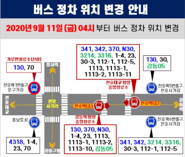 중앙정류소가 신설되면서 천호역 주변을 경유하는 노선버스의 정차 위치가 변경된다. 대부분의 버스는 중앙정류소에 정차하지만 강동구청에서 강동역 방향으로 우회전하는 일부 노선들은 가로변 정류소에 정차하도록 해 차로 변경으로 인한 교통혼잡을 최소화 할 계획이다.