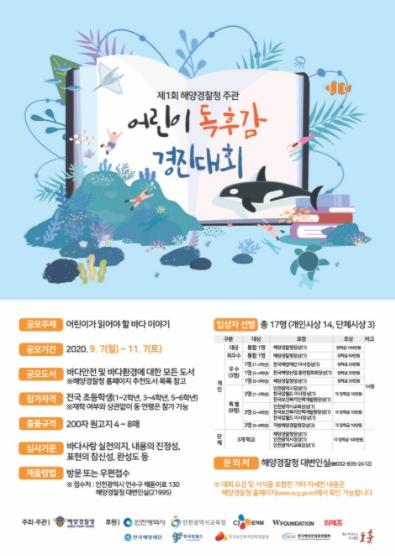 해양경찰청(청장 김홍희)이 주최하고 인천광역시청, 인천광역시교육청, CJ EnM, 위메프, 한국해양재단, 한국해양산업총연합회, 한국잡월드, W재단, 한국보건복지인력개발원, 도서출판 도훈이 후원하는‘제1회 바다사랑 독후감 경진대회’가 이달 7일부터 진행된다.